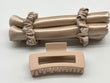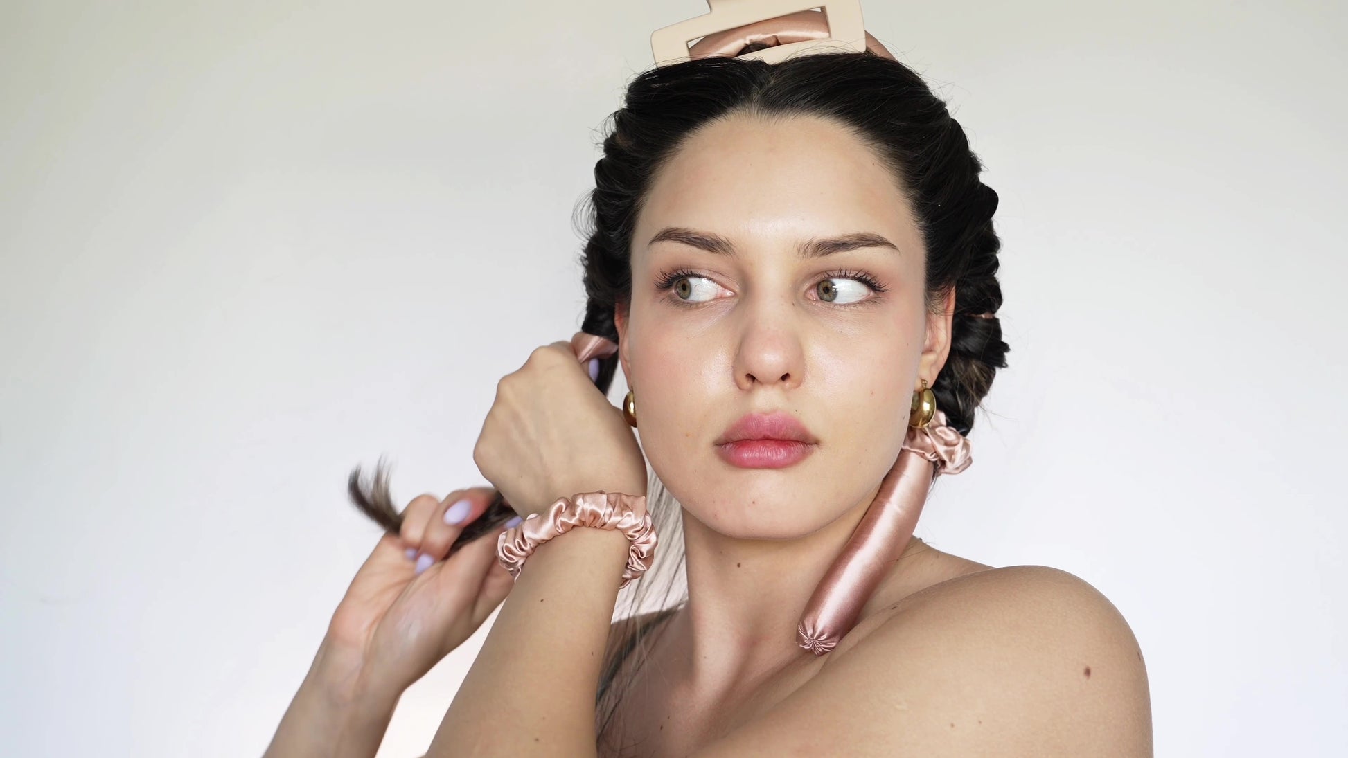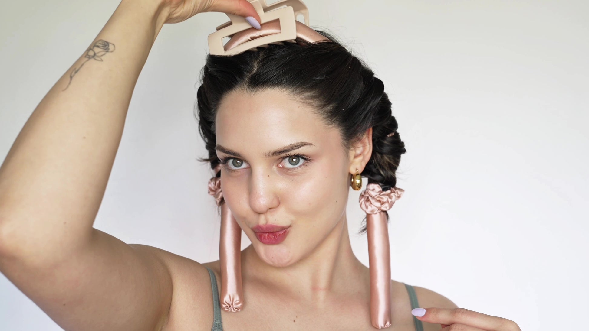 Step 4: Secure the curler and let your hair set: Secure the ends of the hair with your silk hair ties.  Remove the claw clip and keep your curler in for just a few hours, or overnight for best results. And Yes you can sleep with Bare heritage heatless curler! Our curler is designed to be super comfortable for sleep.